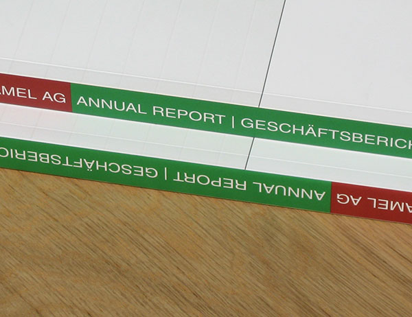 Der Rücken ist mit „Annual Report | Geschäftsbericht 2013“ falzparallel beschriftet und dabei für beide Sprachen „richtig herum“.