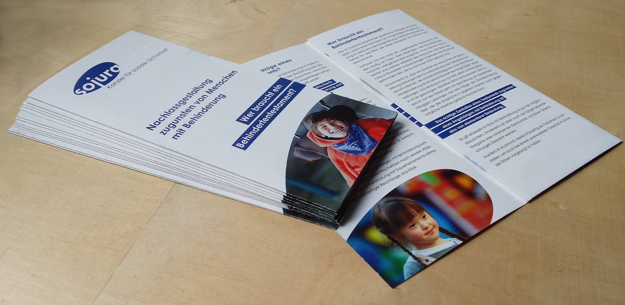 Das Faltblatt haben wir im Corporate Design der Kanzlei sojura (vgl. Logo von 2010) gestaltet. Es informiert übersichtlich zu Testamenten zugunsten von Menschen mit Behinderungen.