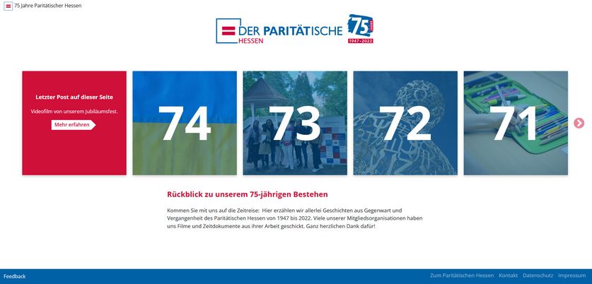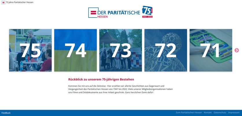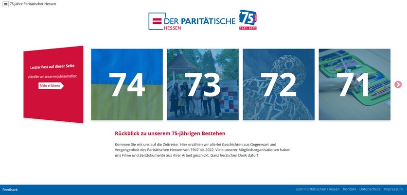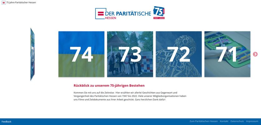 Bei Mouse-over bzw. Touch drehen sich diese Karten, und auf der Rückseite wird eine Kurzinformation und ein weiterführender Link sichtbar. Auf den Detailseiten erfährt man Interessantes und Berührendes über den Paritätischen Hessen und seine Mitgliedsorganisationen in Form von Filmen, Bildern und Texten.