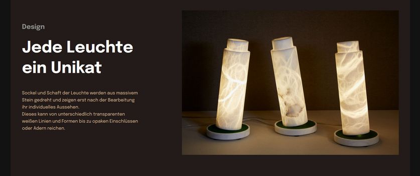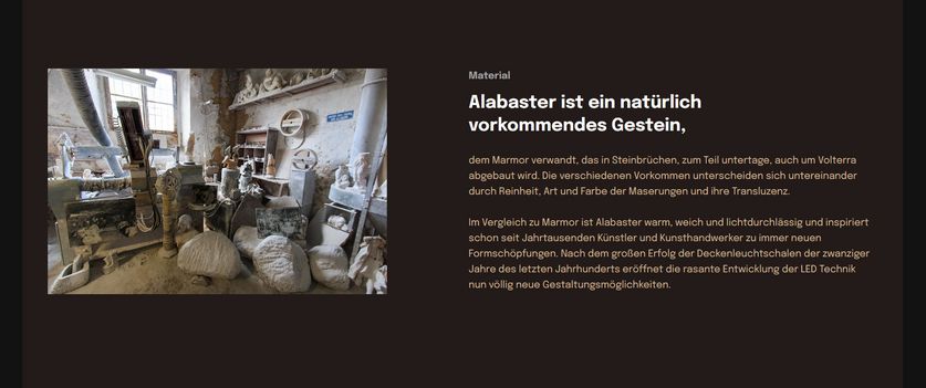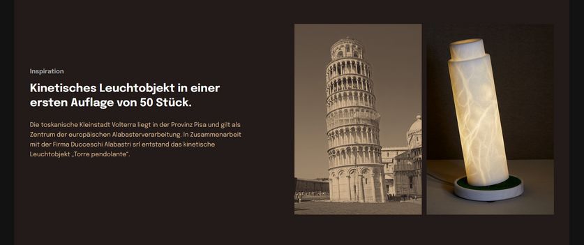 Auf einem dunkel gehalten Onepager wird die Designerleuchte Torre pendolante zur Geltung gebracht.