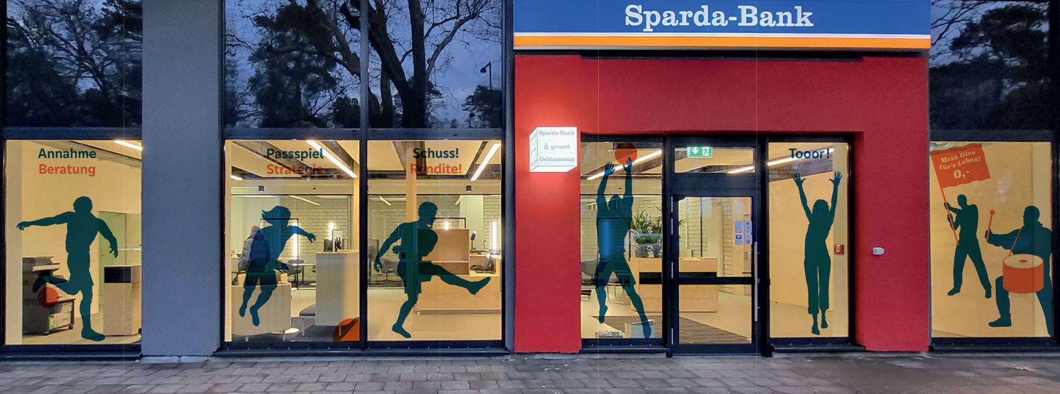Scherenschnittartige Figuren bespielen die Fassade. Sie bilden eine dynamische Szene, in deren Abfolge Angebote der Sparda-Bank geschickt integriert sind.