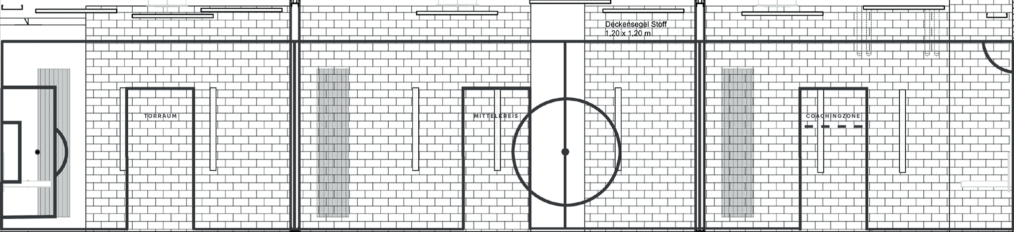 Die Linien der Spielfeldmarkierung werden als grafische Elemente genutzt. Schriftzüge wie „Torraum“ und „Teamkabine“ sorgen dabei für einen humorvollen Akzent.